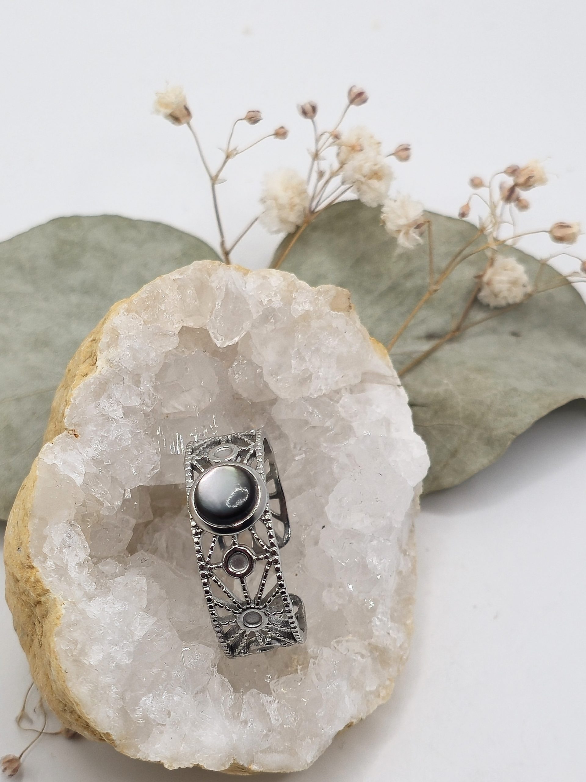 Le cabochon, à la surface lisse et arrondie, met en valeur la profondeur naturelle de la nacre. En effet l’ensemble crée un équilibre entre douceur organique et structure contemporaine.