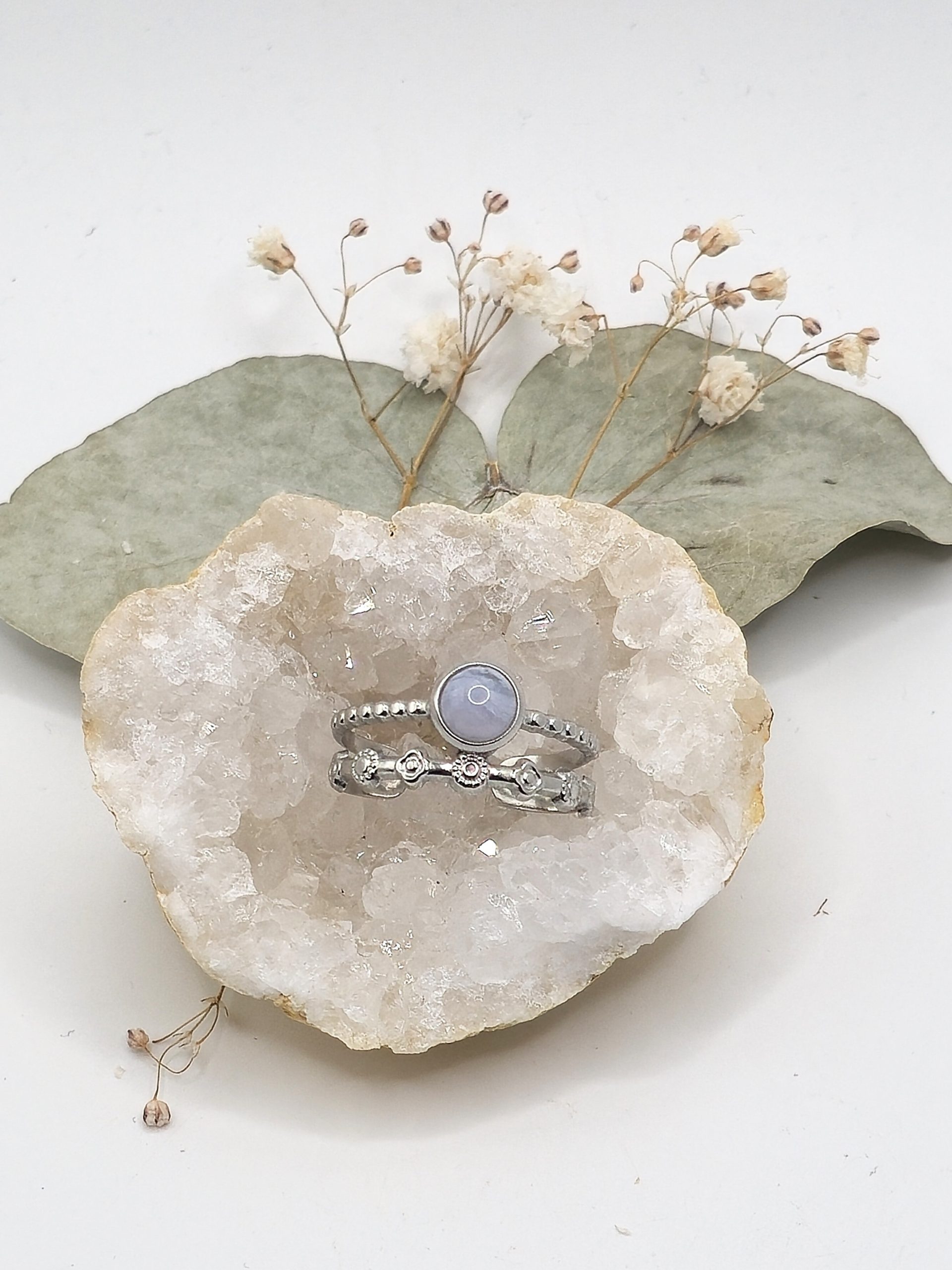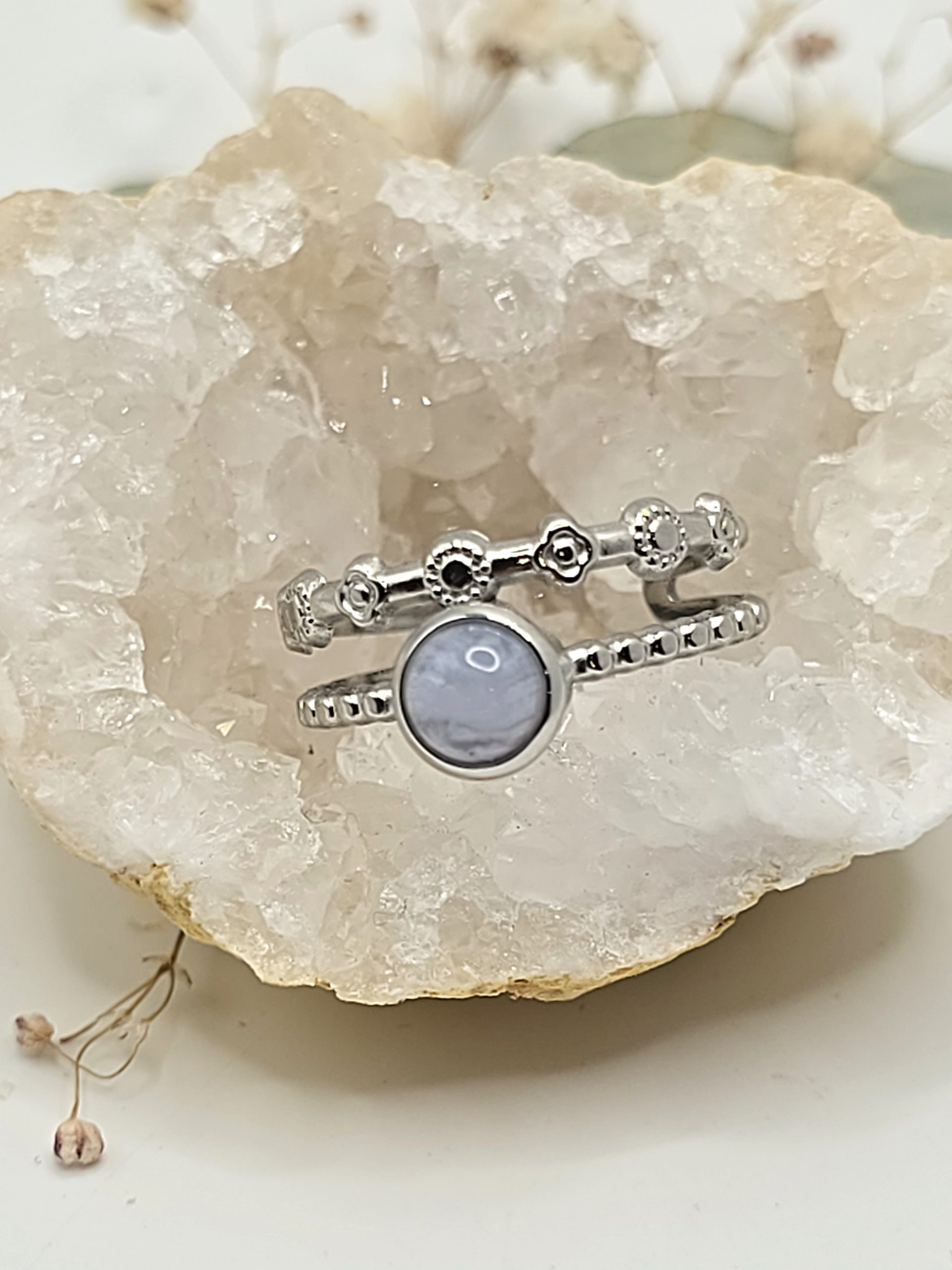 Cette bague en acier inoxydable ornée d’un cabochon en calcédoine bleue lace est une création délicate, pensée pour celles et ceux qui recherchent un bijou à la fois apaisant, élégant et facile à porter au quotidien.