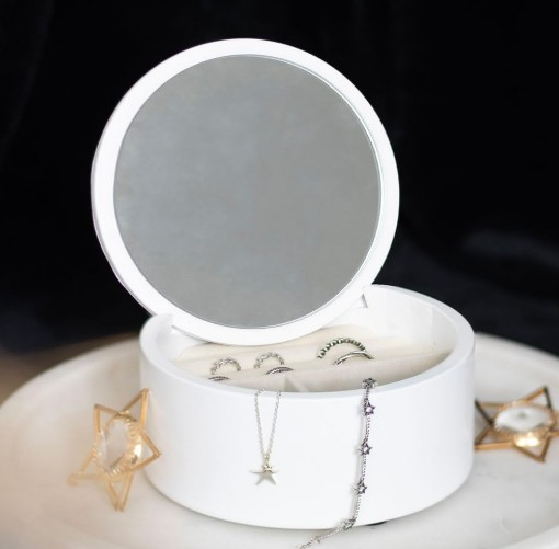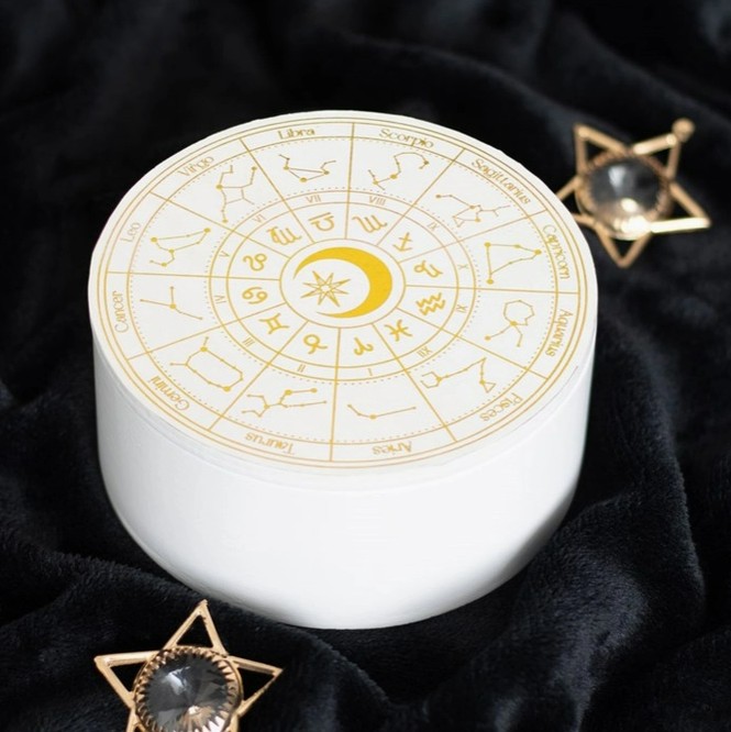 Disposez vos colliers, bagues et bracelets de valeur dans cette ravissante boîte à bijoux de couleur blanche, embellie d’un design représentant une roue astrologique et équipée d’un miroir pratique situé sur le couvercle.