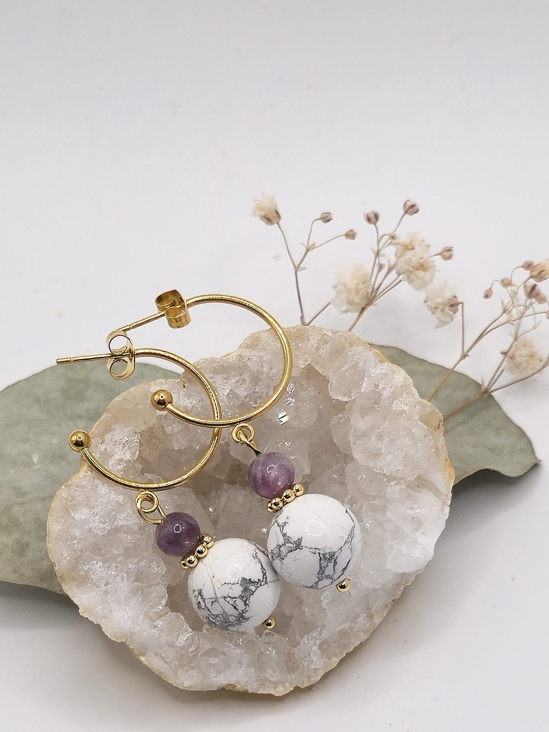Boucles d’Oreilles Créoles Howlite & Lépidolite