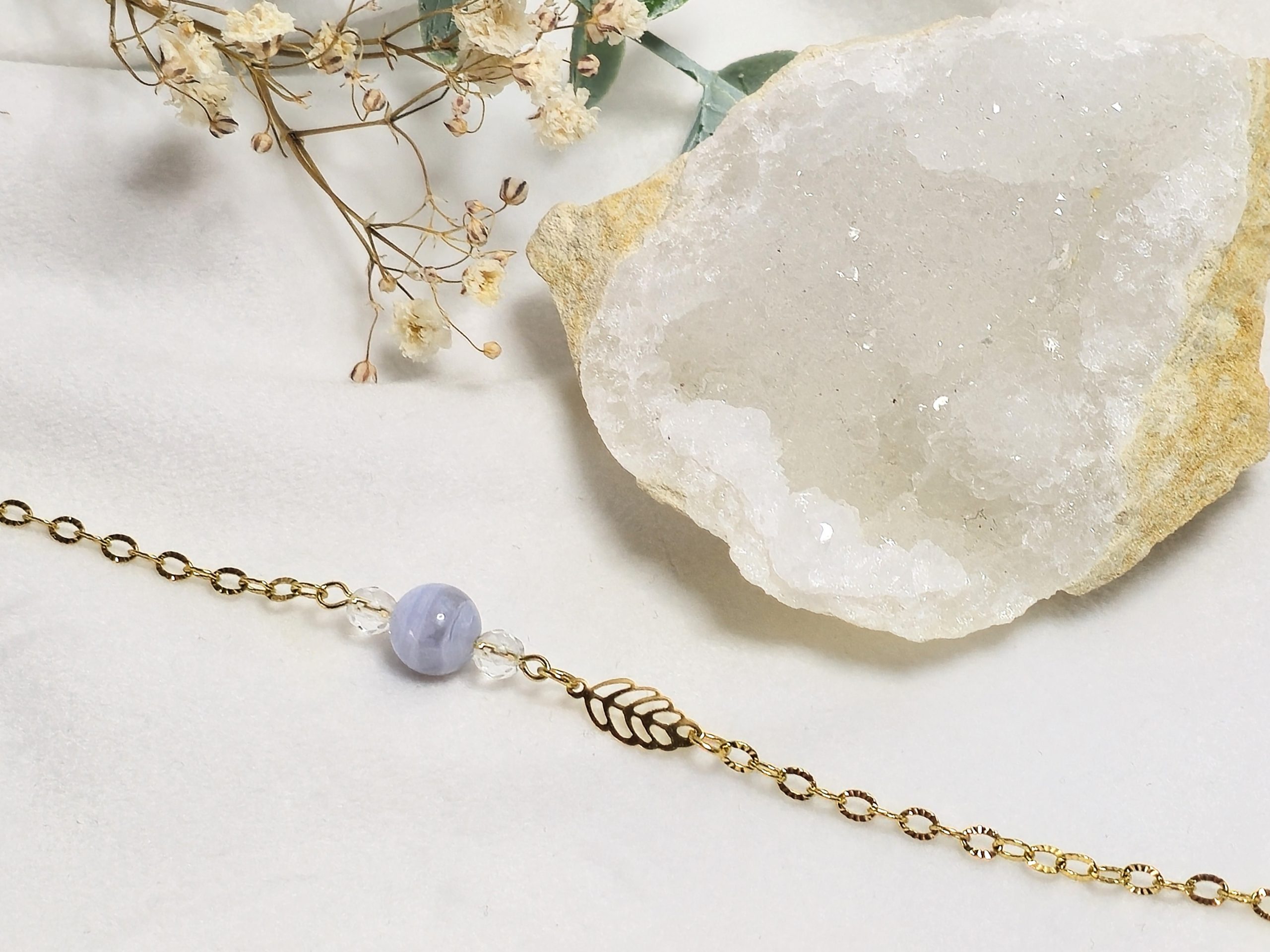 Ce bracelet en cristal de roche et calcédoine bleue lace, monté sur acier inoxydable doré, est une création lumineuse et apaisante, pensée pour accompagner le quotidien avec douceur et clarté.
