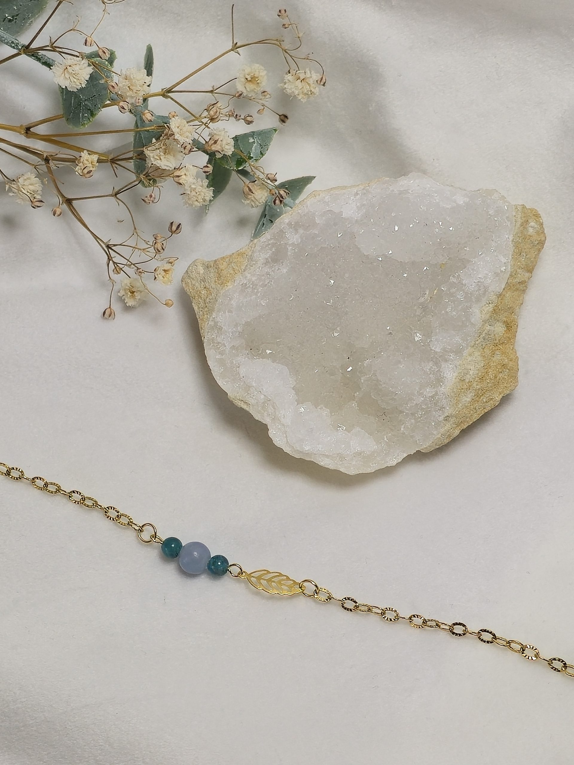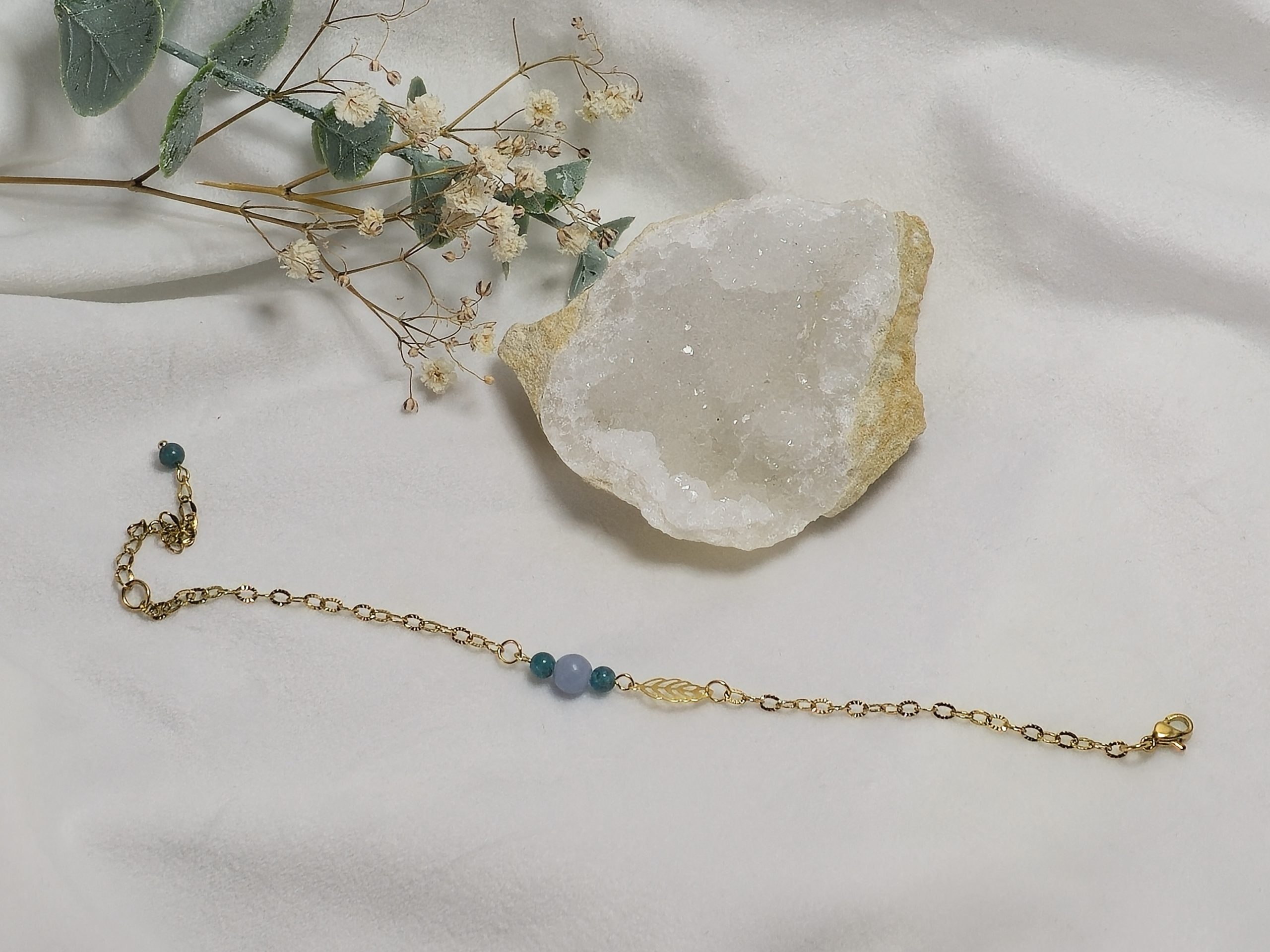 L’apatite et l’angélite dévoilent des nuances bleutées apaisantes. Ainsi, leurs couleurs rappellent le ciel clair ou l’eau tranquille. De plus, leur association crée un contraste subtil avec l’or du bracelet, ce qui renforce l’élégance de l’ensemble. Chaque pierre possède ses propres nuances, ce qui rend chaque bracelet légèrement unique.