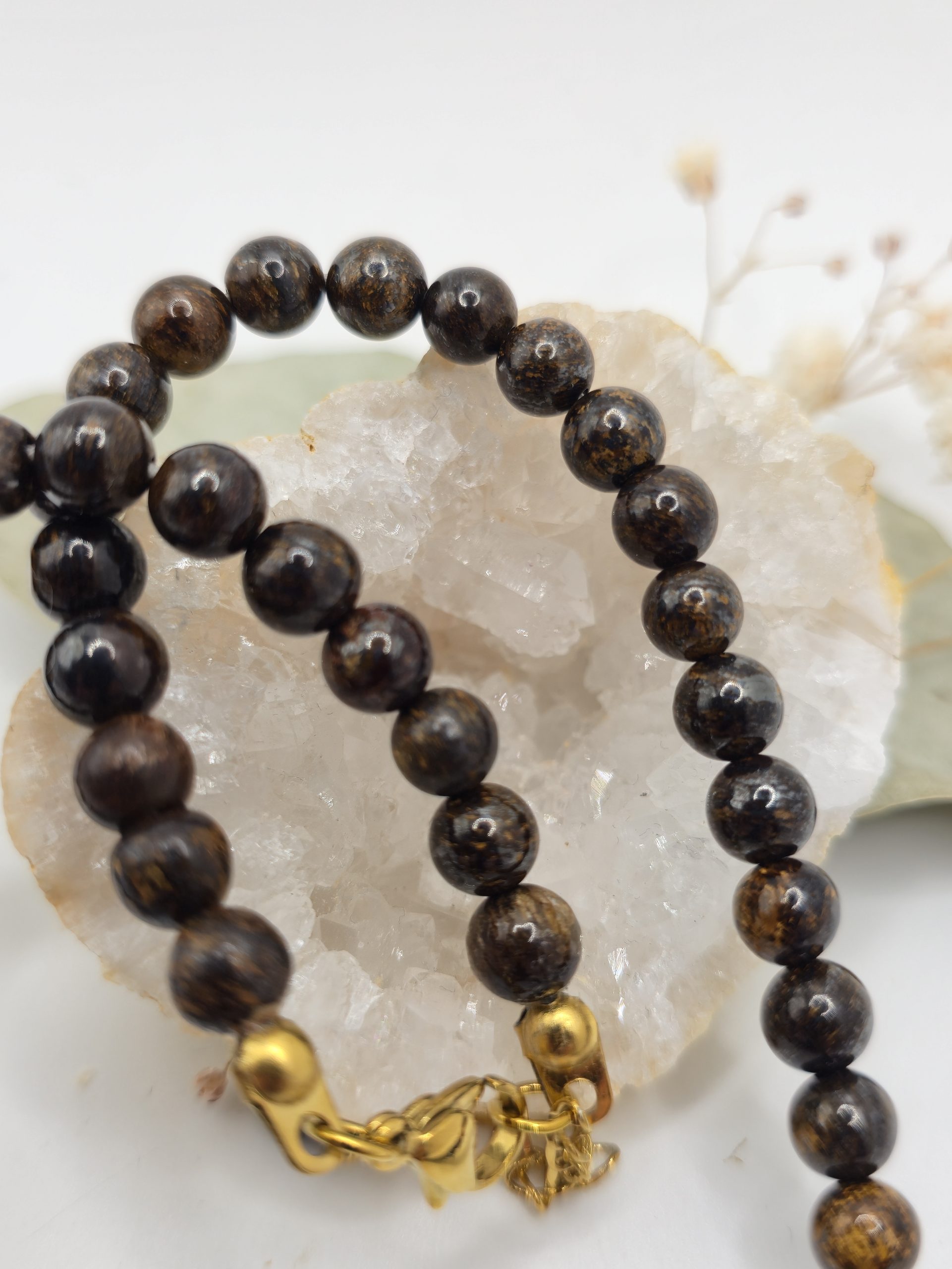 Ce collier met en avant la richesse naturelle de la bronzite à travers un design à la fois sobre et affirmé. En effet, les perles aux teintes brunes et légèrement irisées apportent une profondeur unique au bijou. Ainsi, chaque collier dévoile des nuances subtiles qui varient selon la lumière.