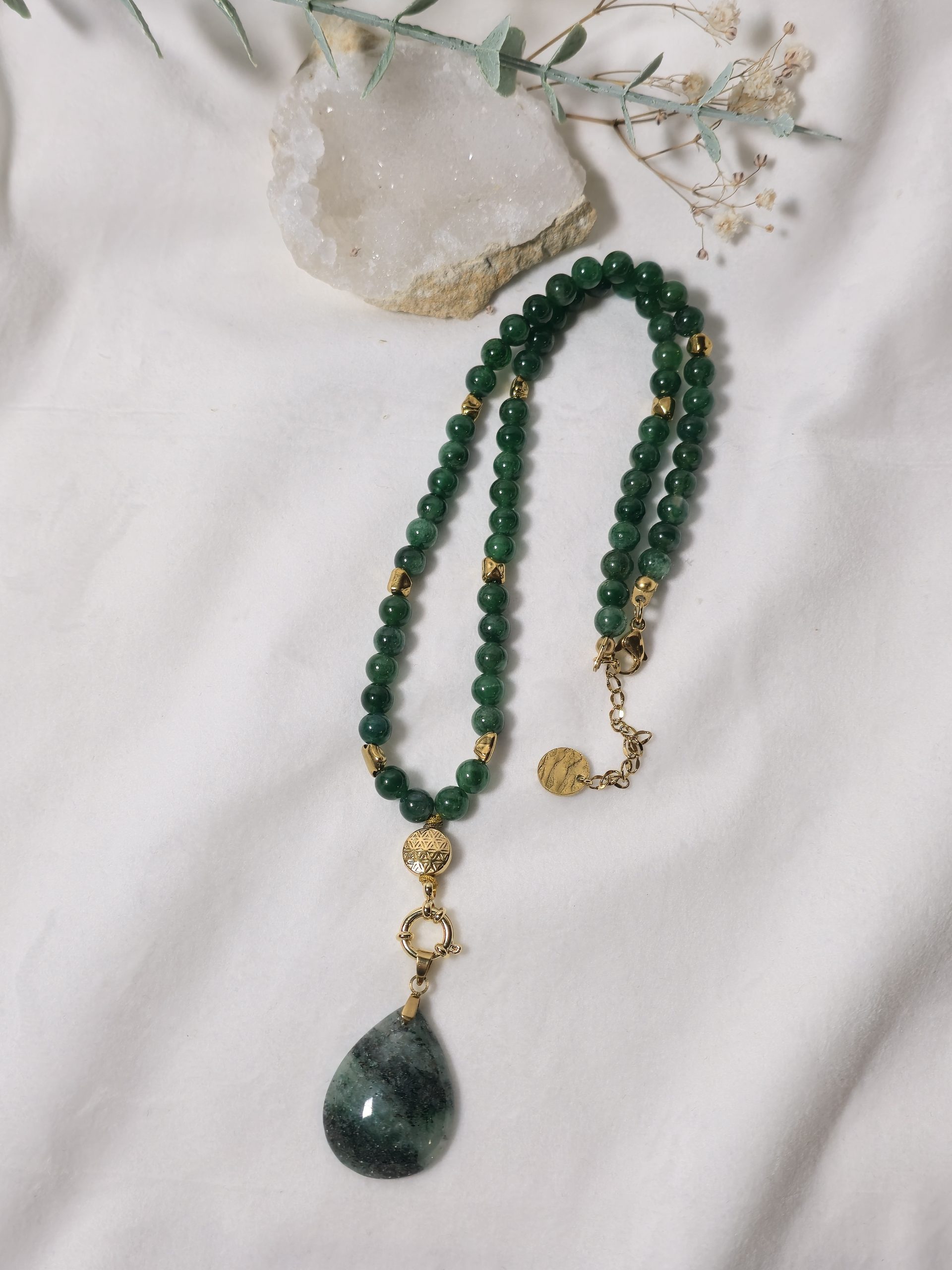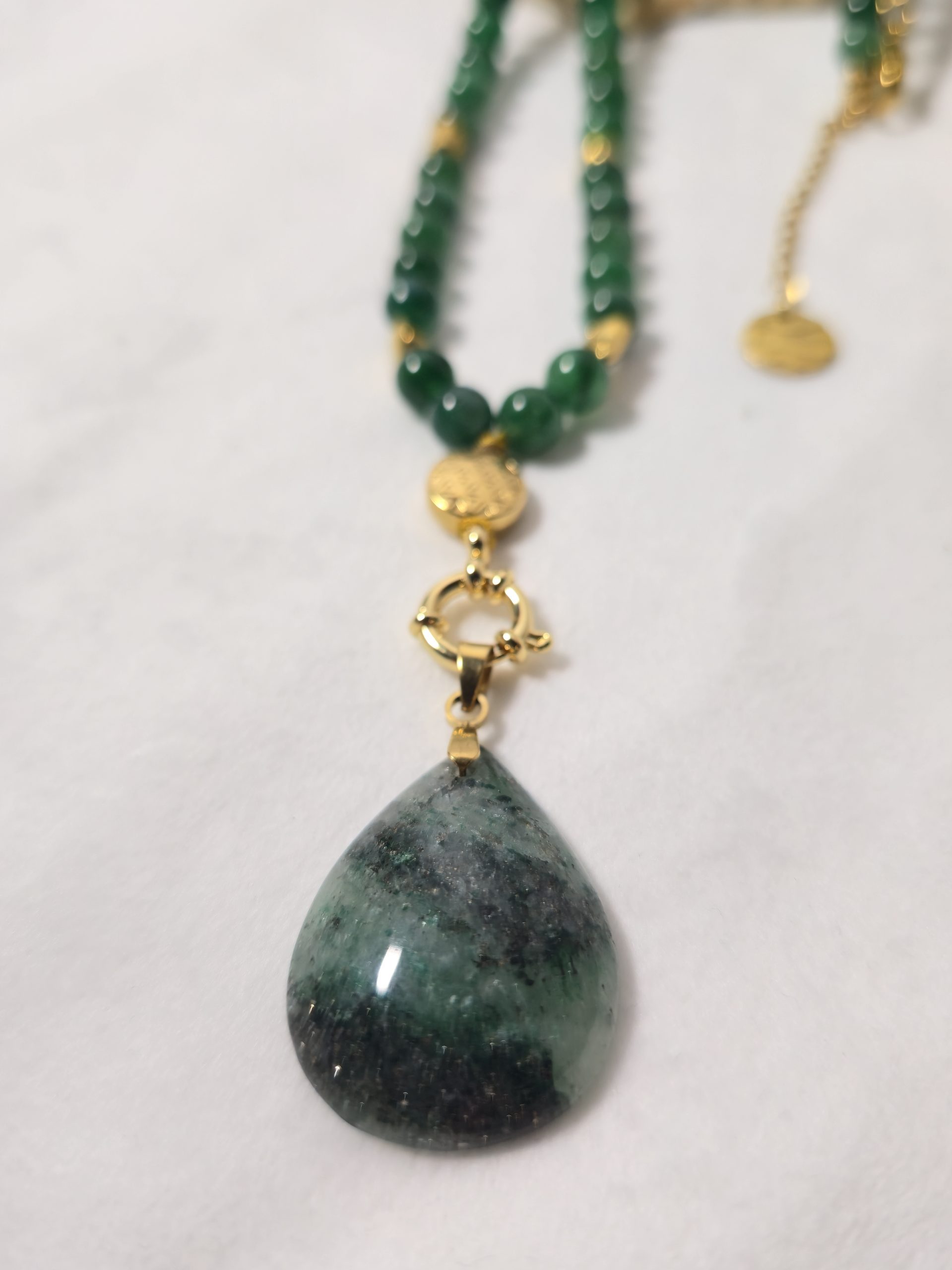 Ce collier en fuchsite et acier inoxydable doré est un bijou lumineux et réconfortant, pensé pour accompagner le quotidien avec douceur et équilibre.