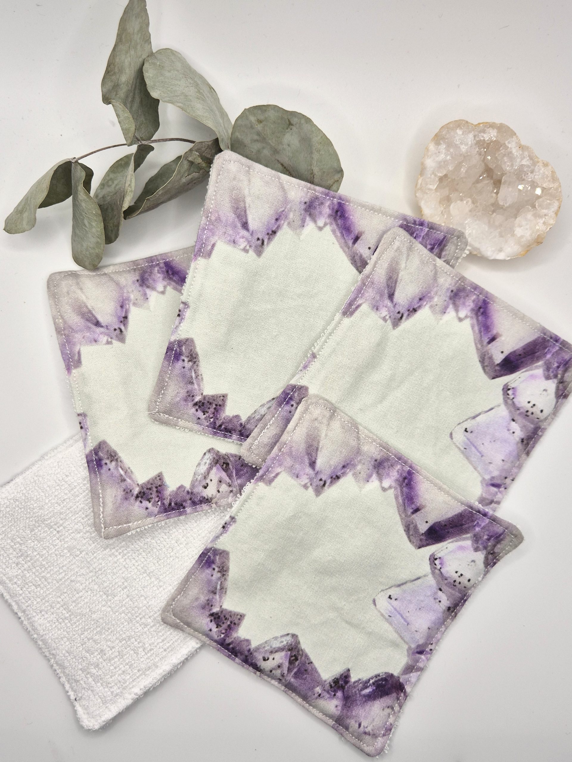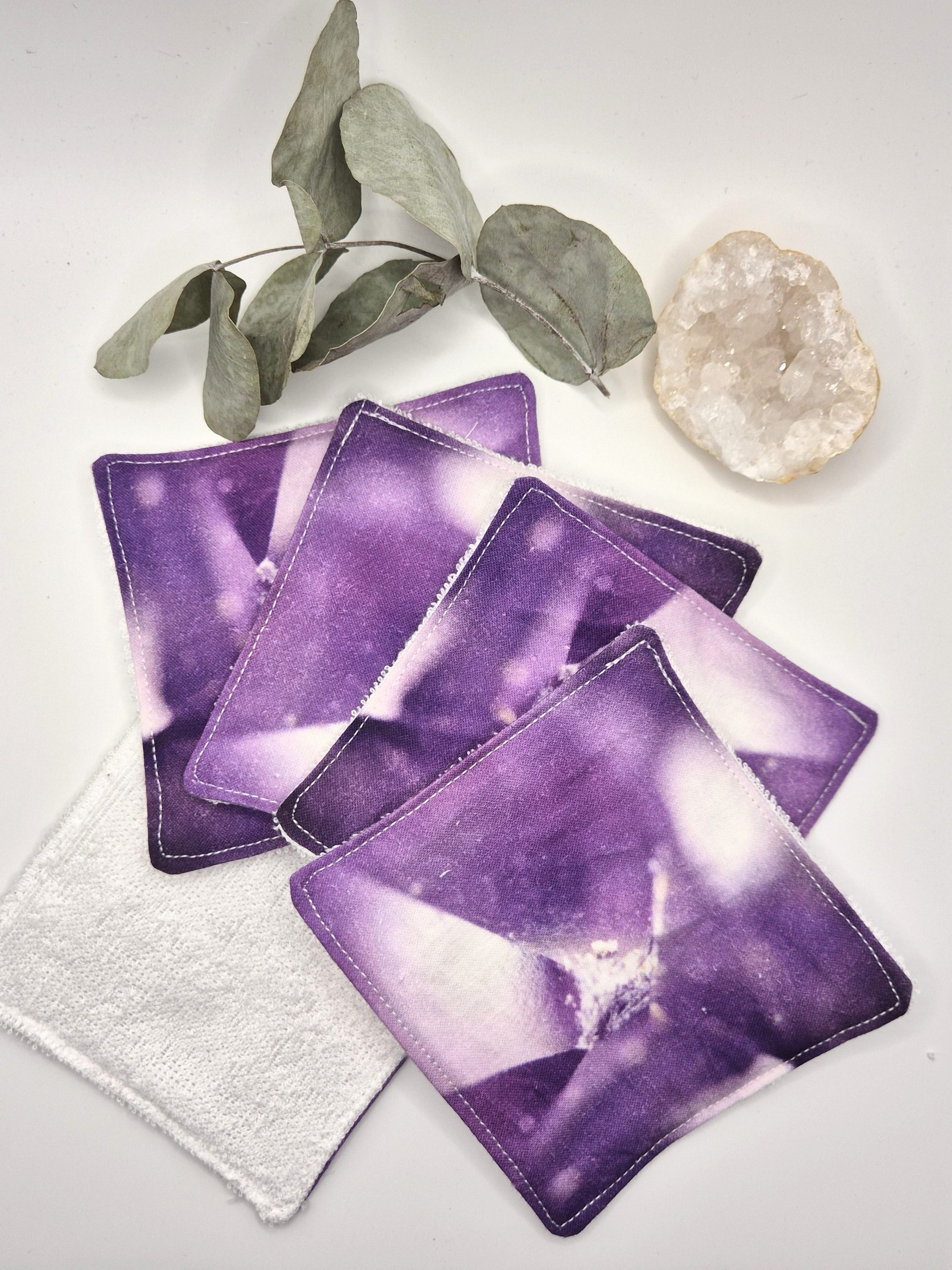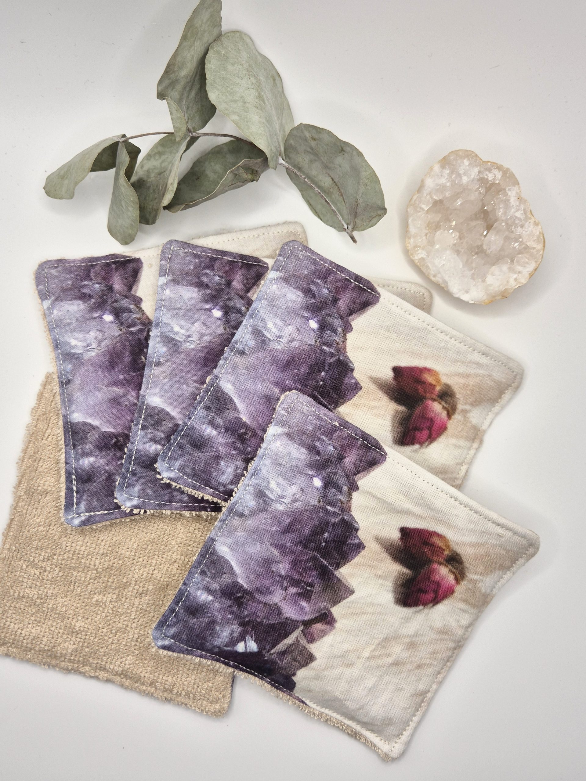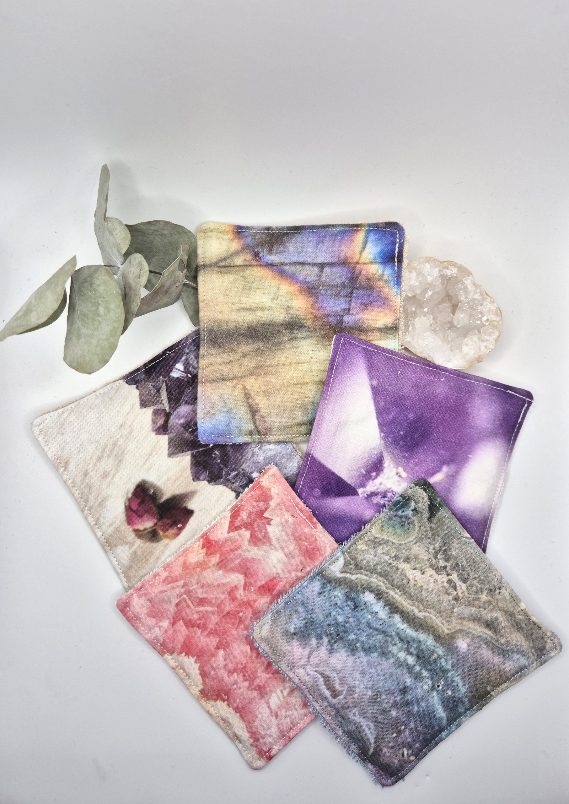 ✨ Offrez à votre peau douceur, beauté et éthique avec nos lingettes lavables minérales, créées à partir de mes propres photos de minéraux authentiques (améthyste, fluorite, rhodochrosite, labradorite, quartz, malachite, émeraude, etc.).
