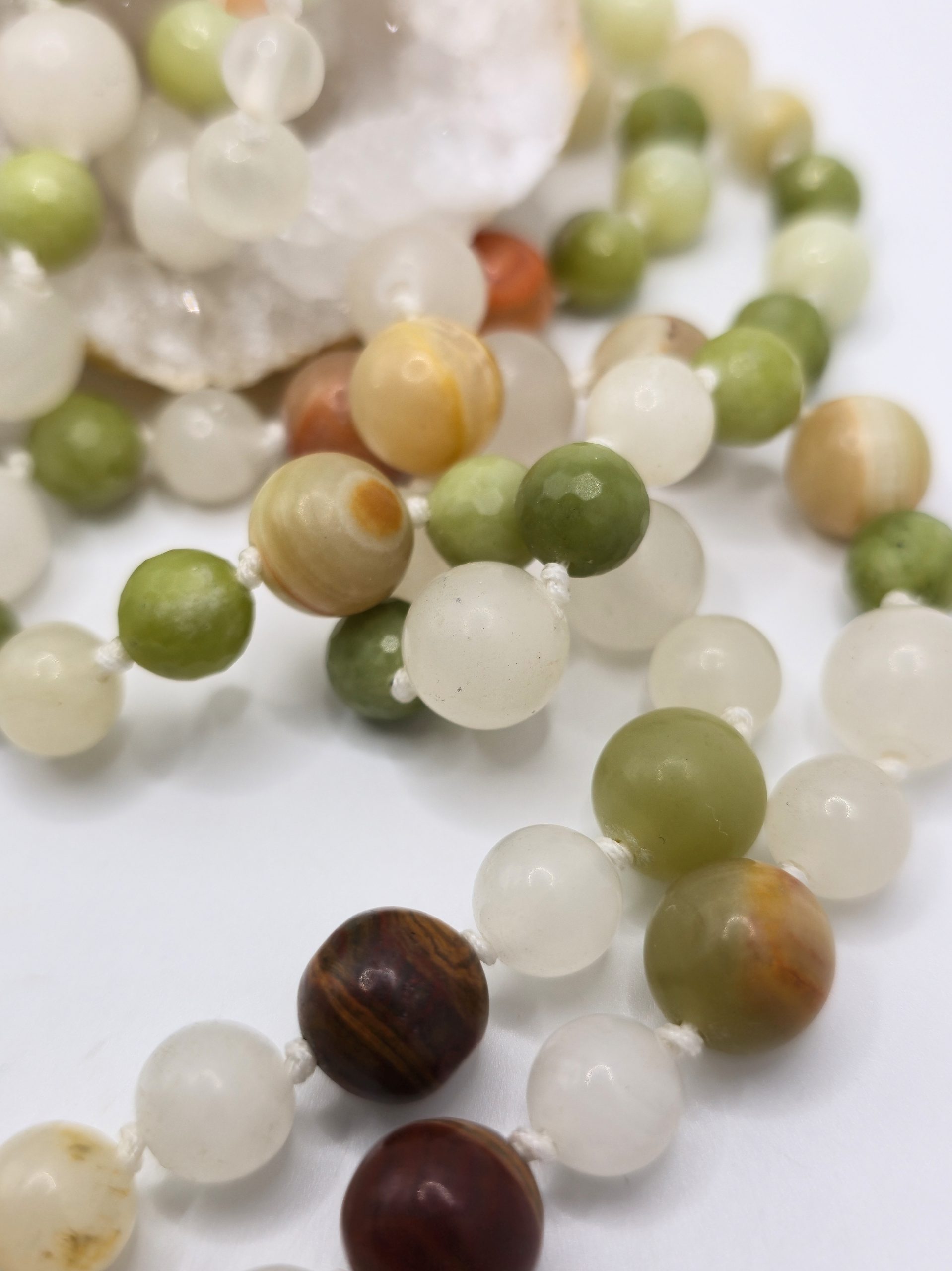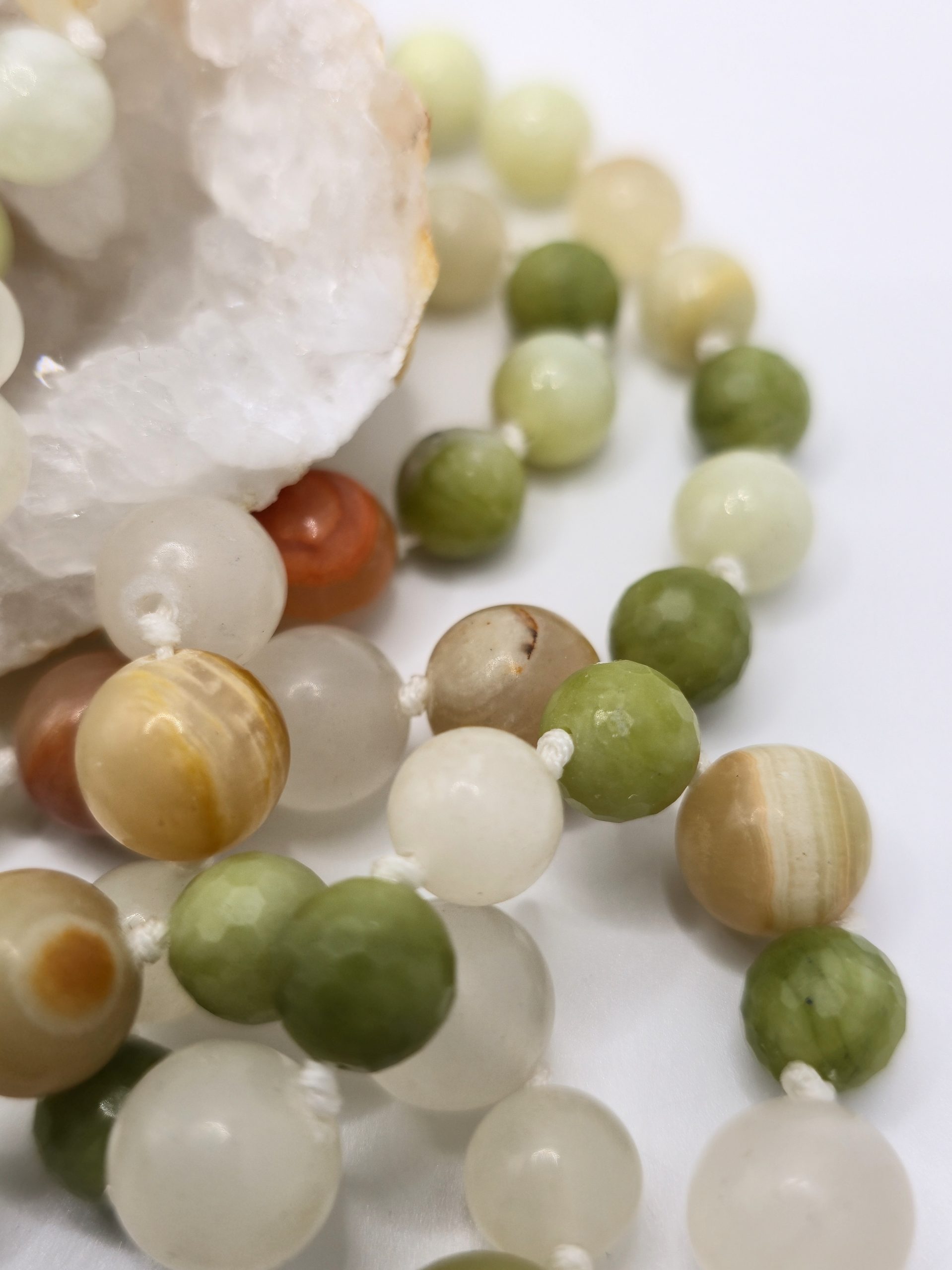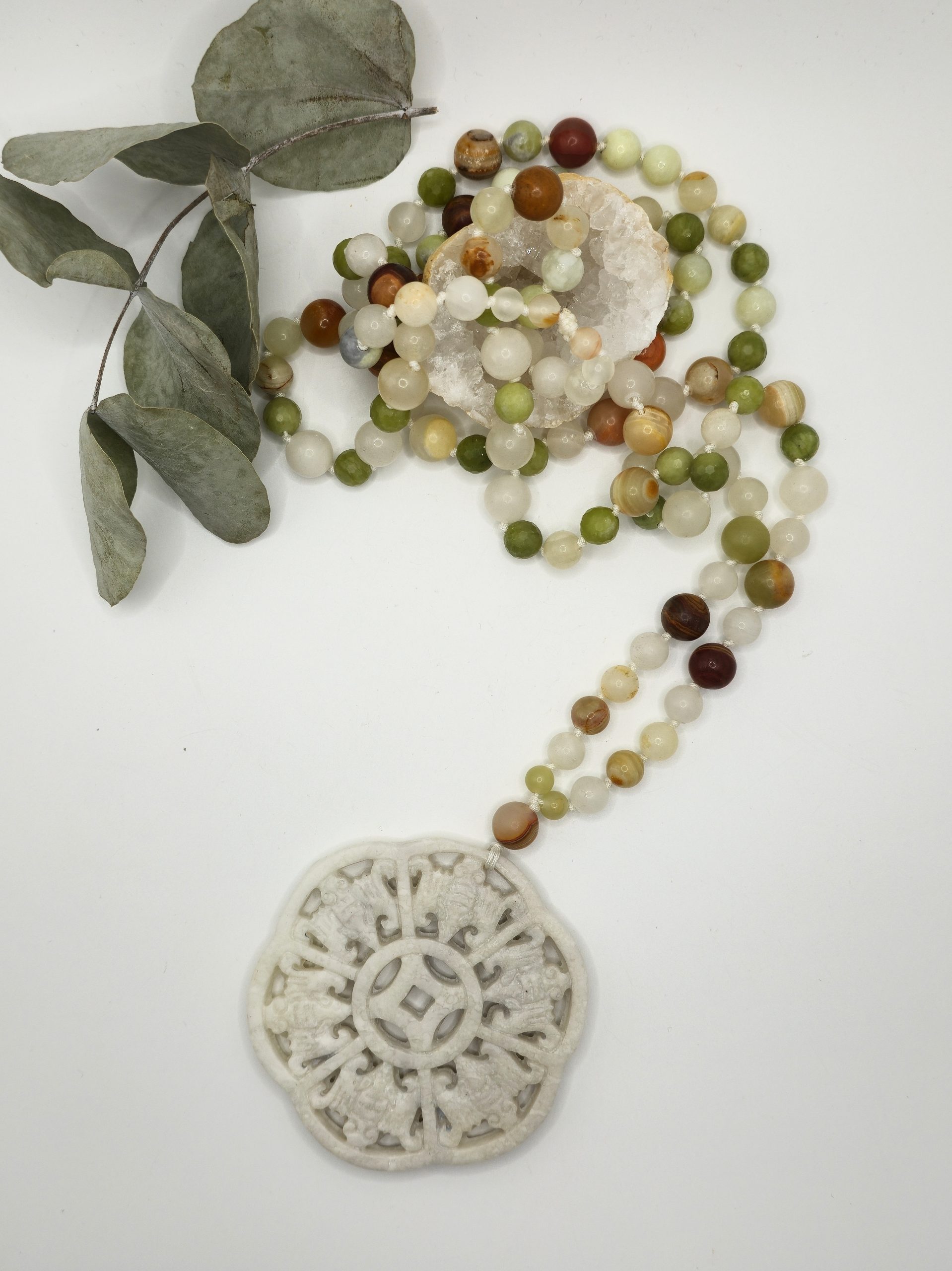 Composé de jade de Hetian et d’aragonite du Pakistan, ce mala diffuse une vibration calme et structurante.