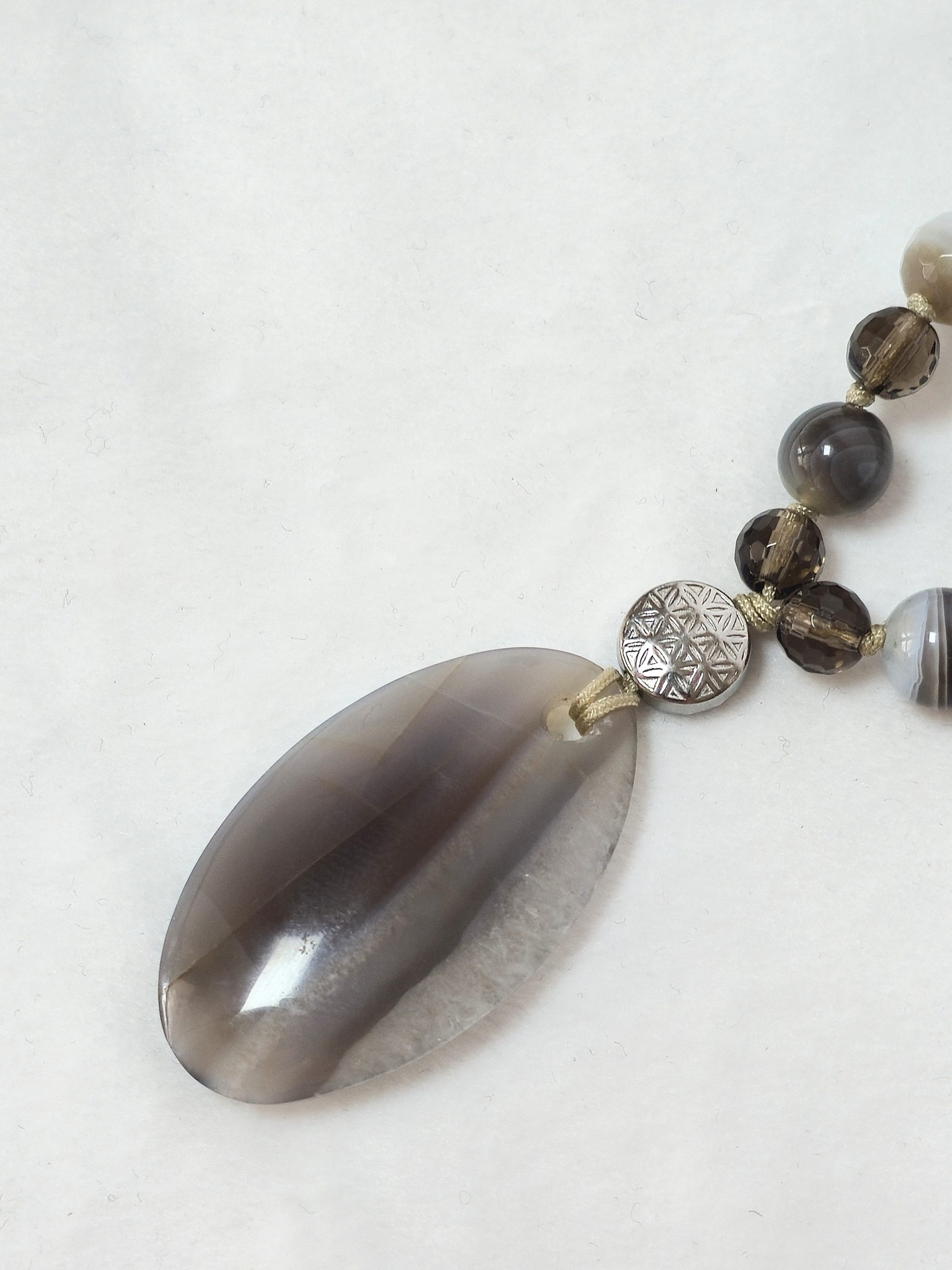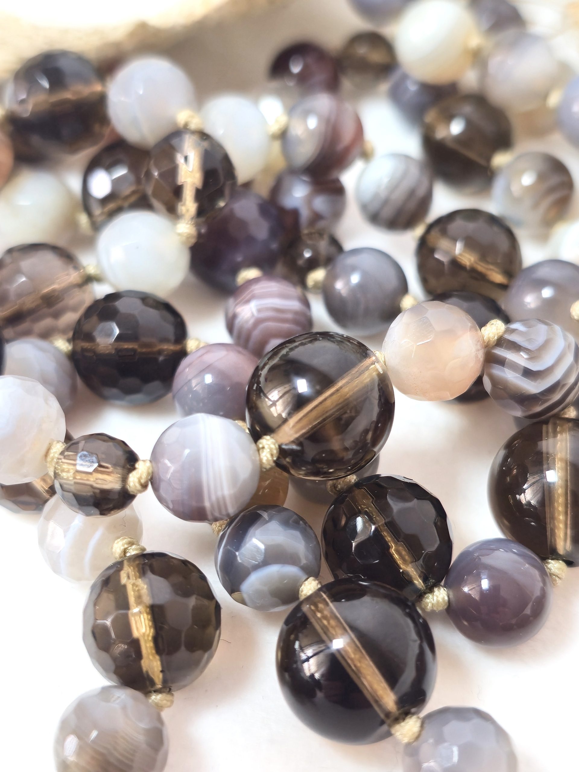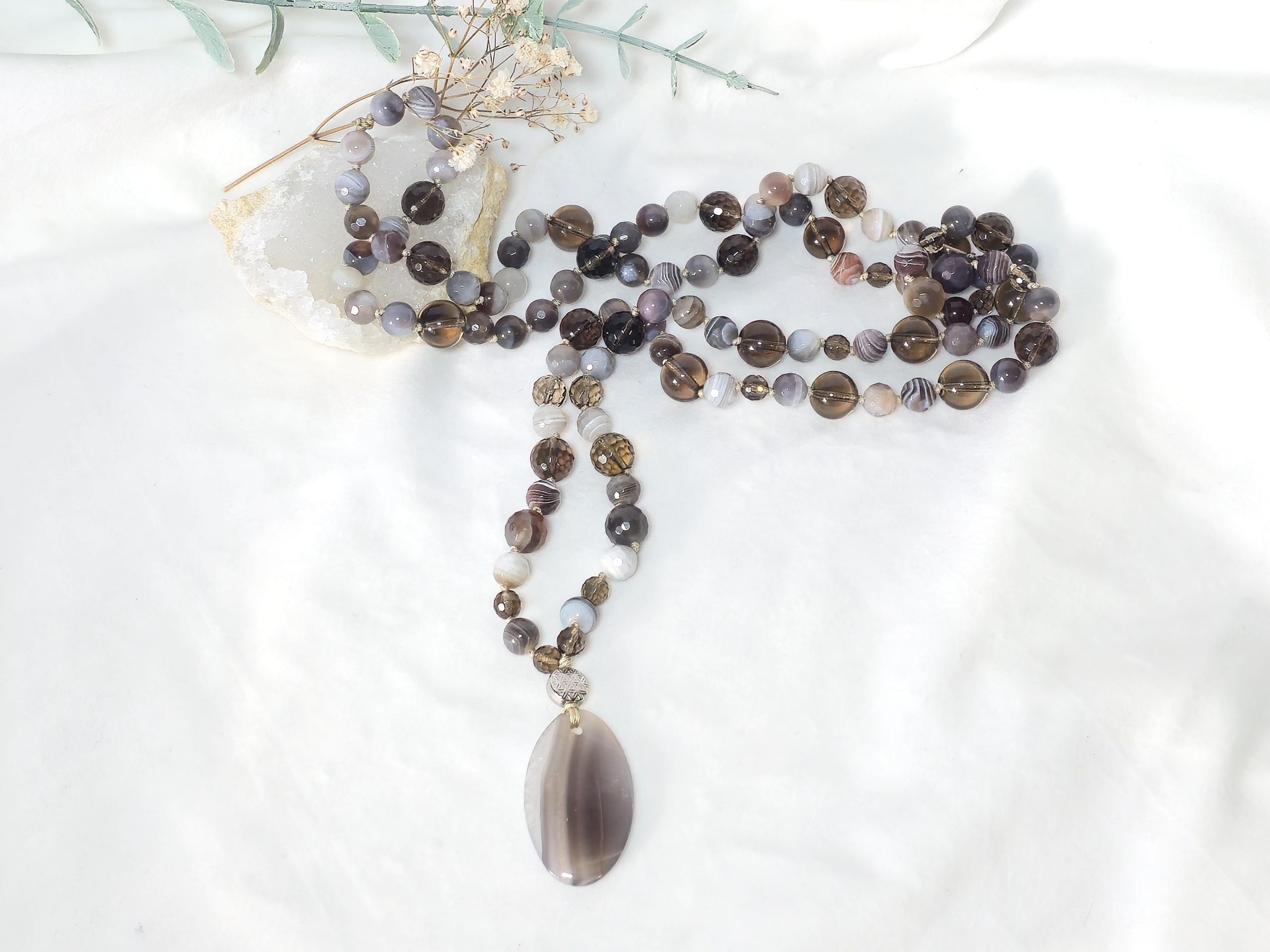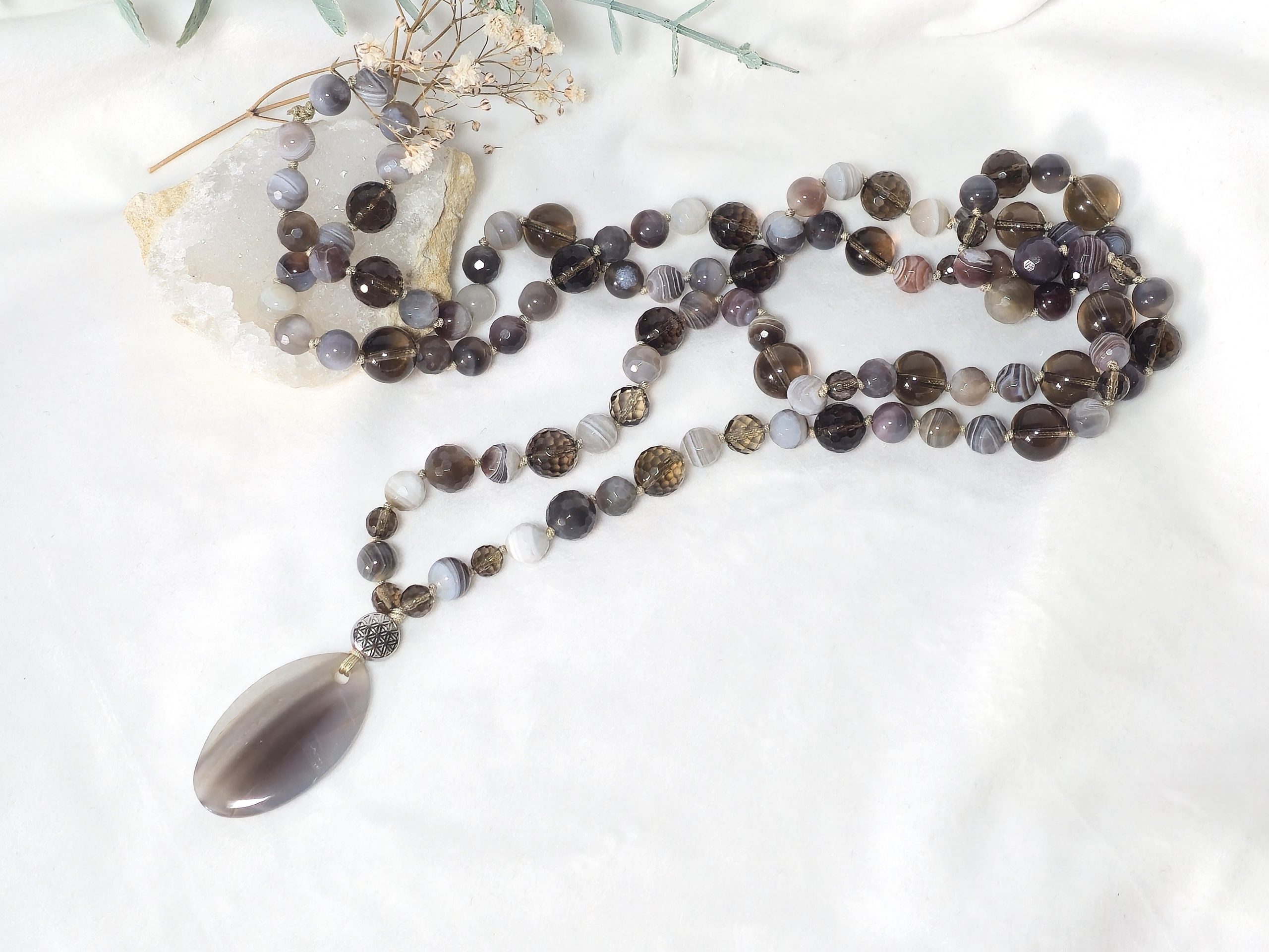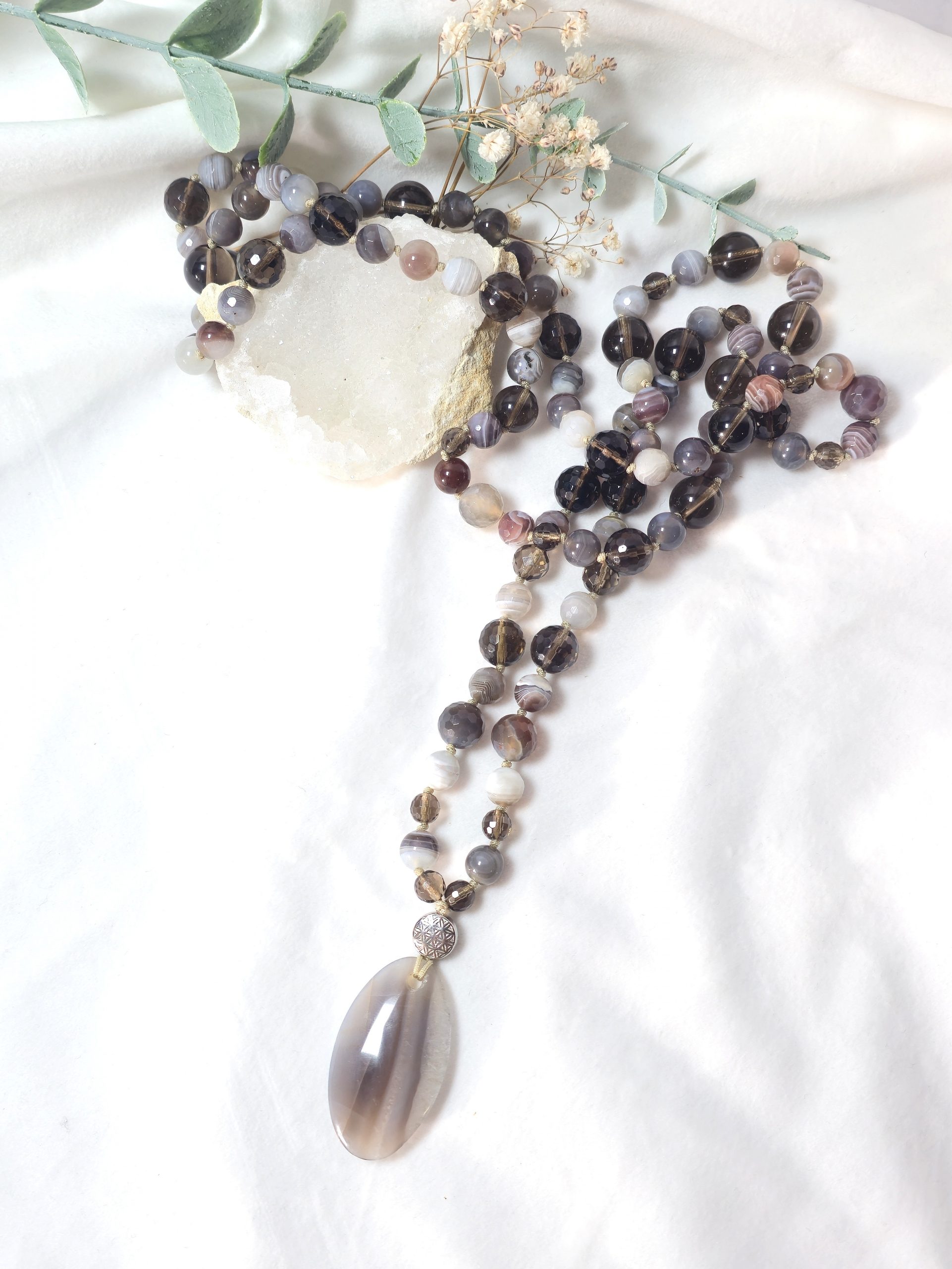 Le mala agate du Botswana quartz fumé Rester Debout est un mala de soutien conçu pour accompagner les périodes difficiles.