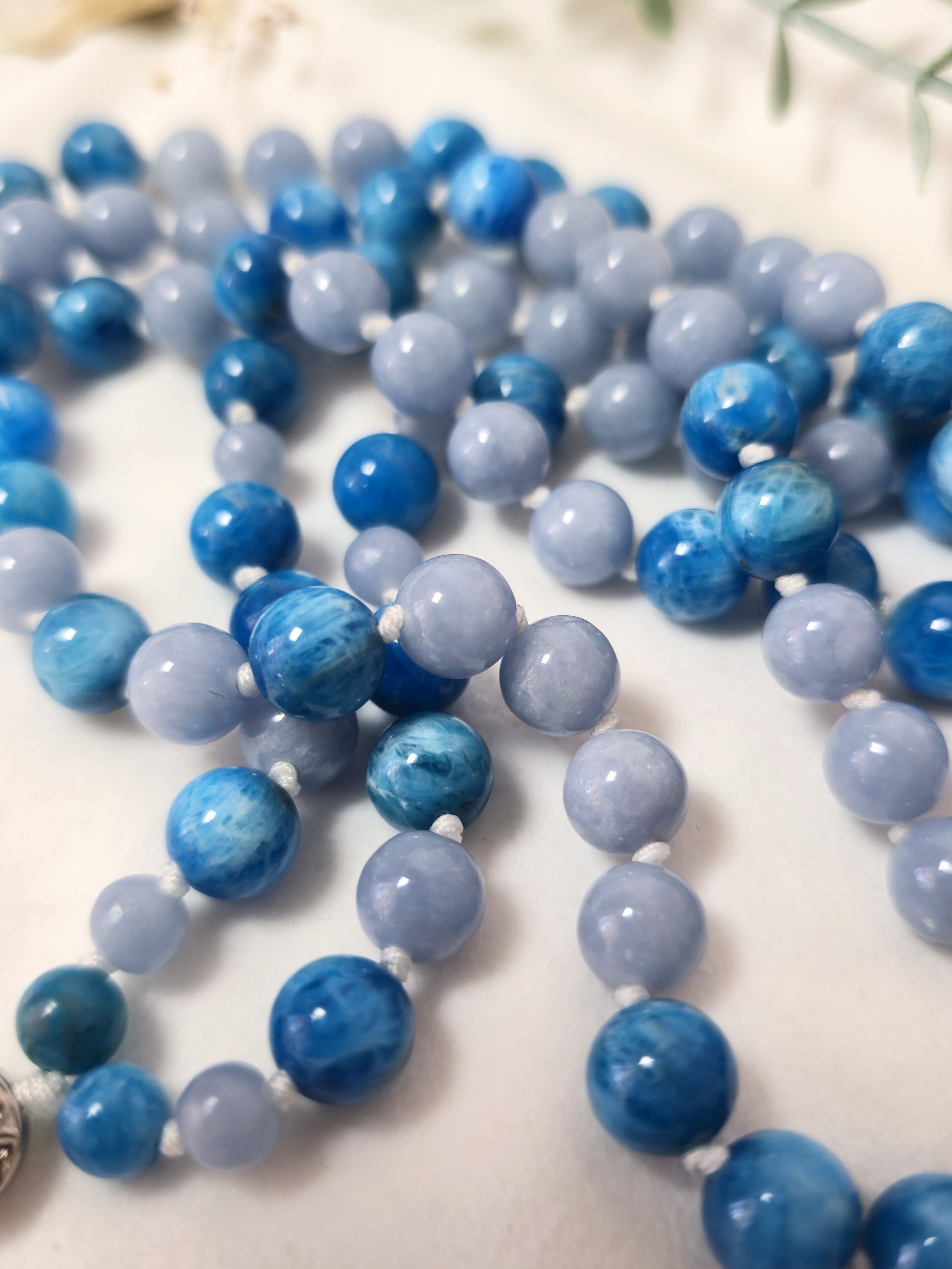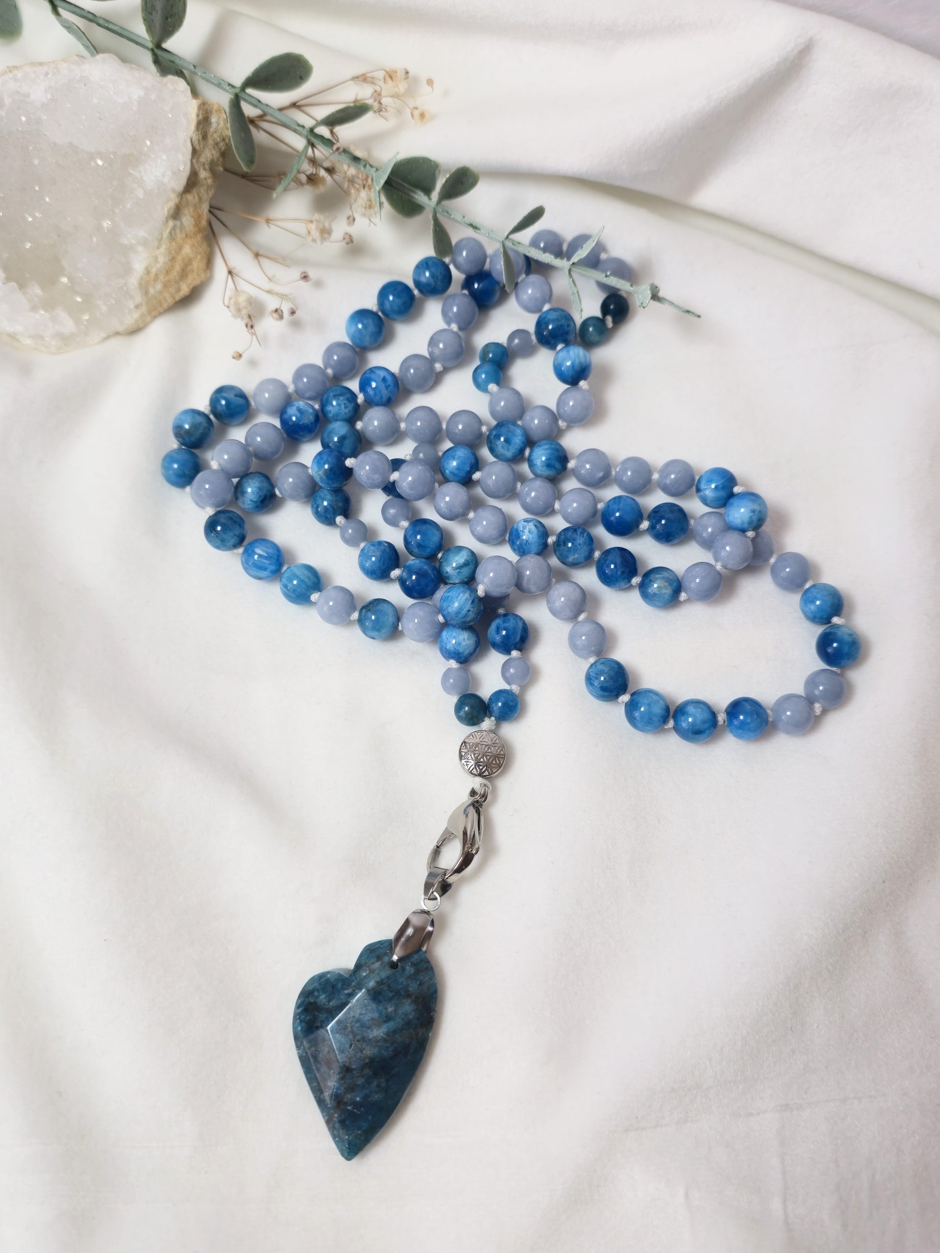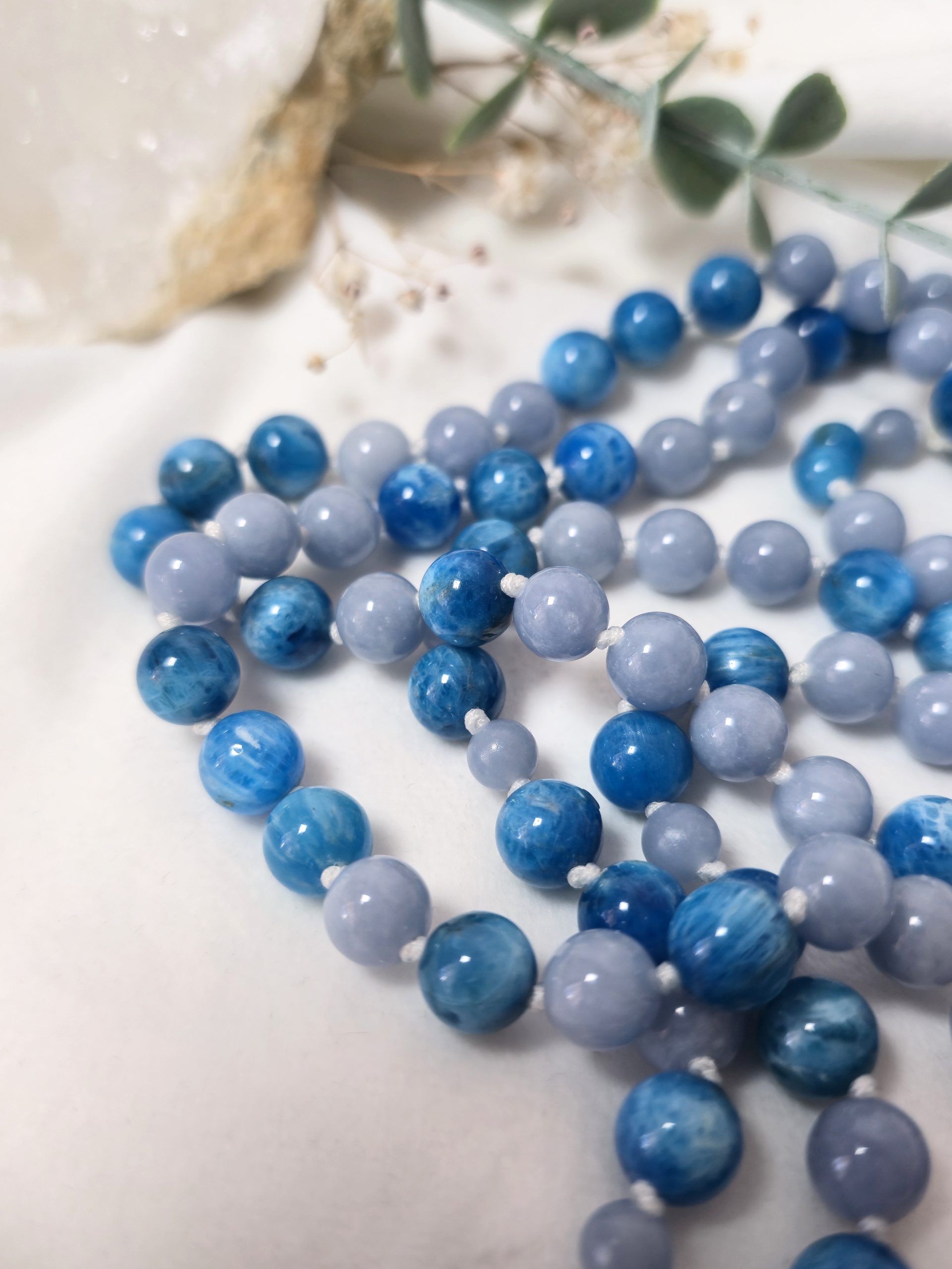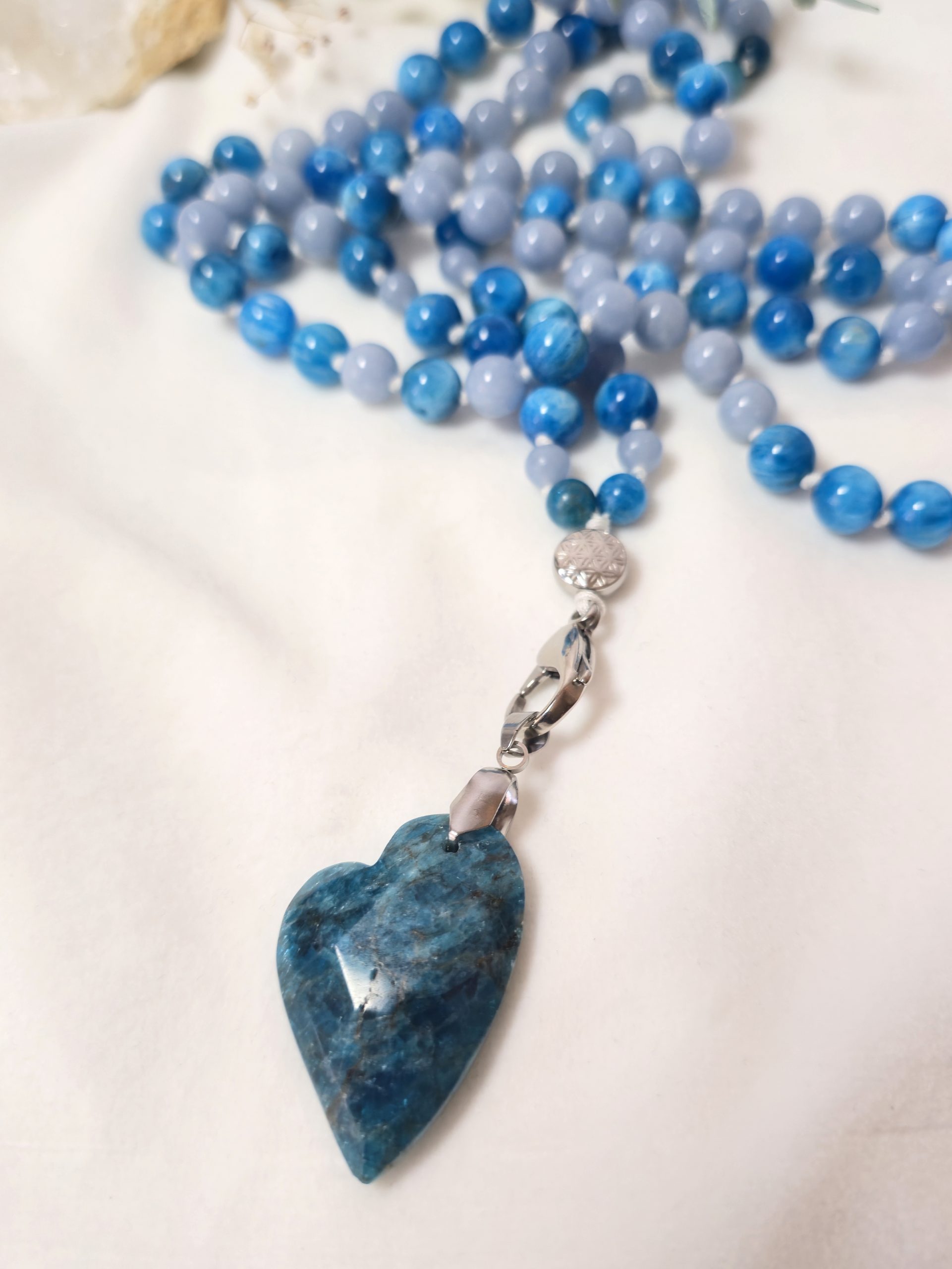 Composé d’angélite et d’apatite, ce mala soutient une connexion douce à soi, tout en favorisant une communication sincère et apaisée.
