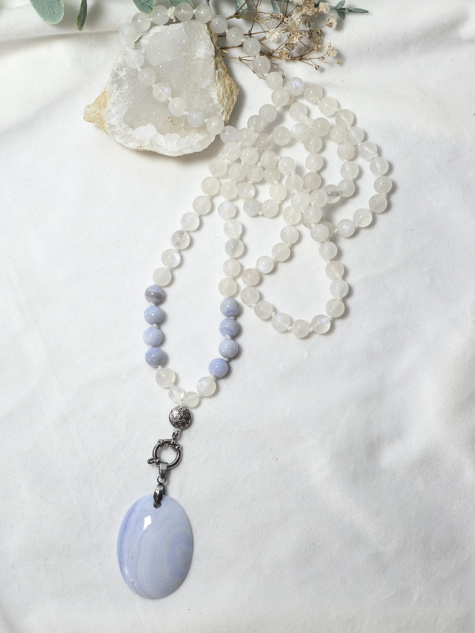 La péristérite soutient l’intuition et la perception subtile, tandis que la calcédoine bleue aide à apaiser le mental et à exprimer ce qui est juste, sans agitation.
