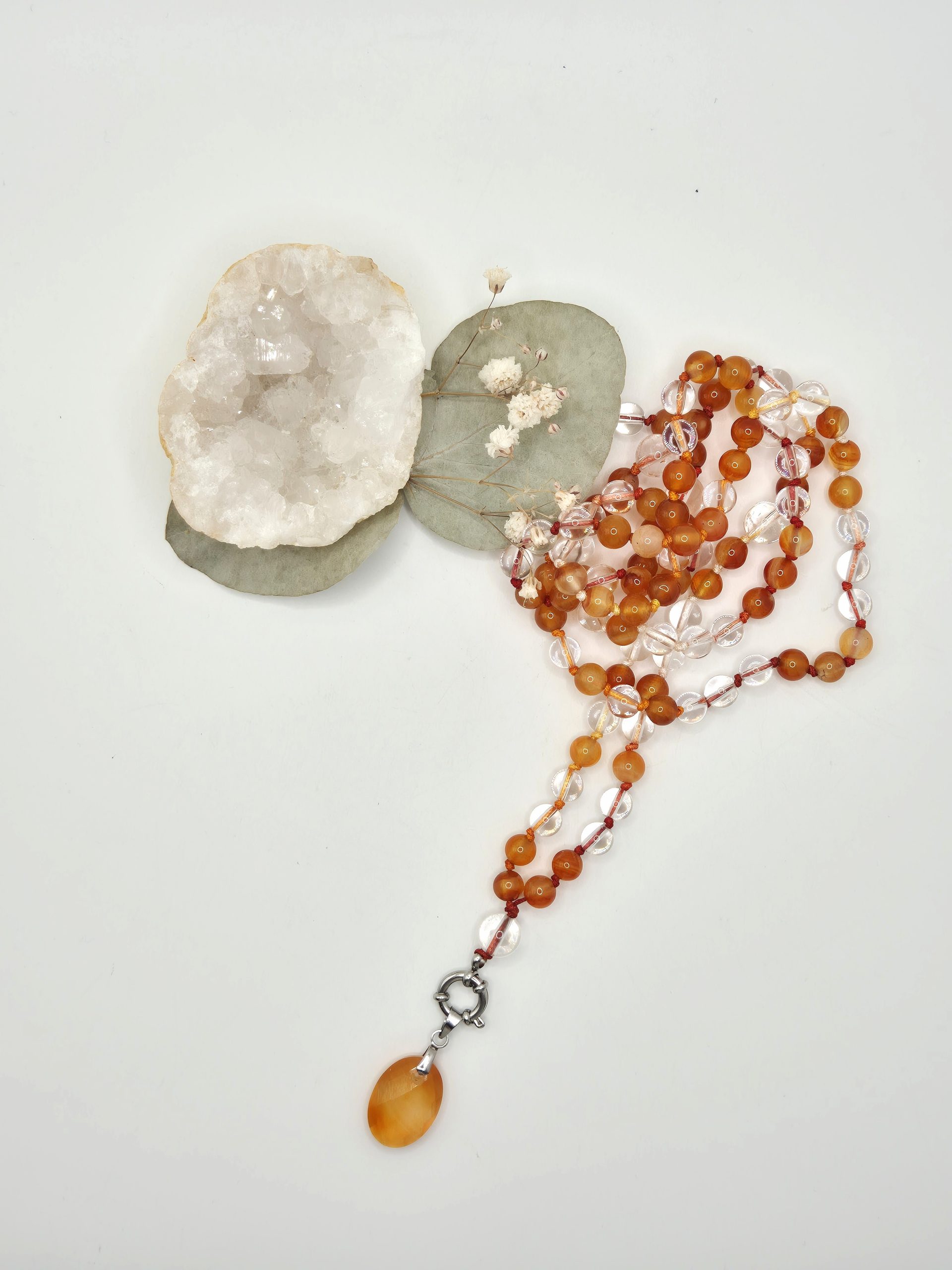 La cornaline et le cristal de roche forment une association dynamique et équilibrante. En effet, ce duo évoque la vitalité, la motivation et la clarté mentale. Ainsi, il soutient une énergie propice à l’action tout en maintenant une certaine stabilité.