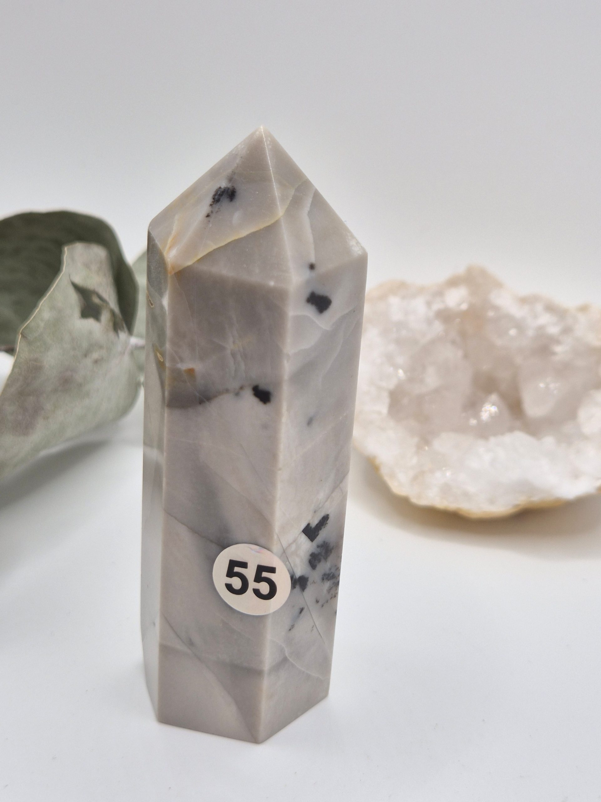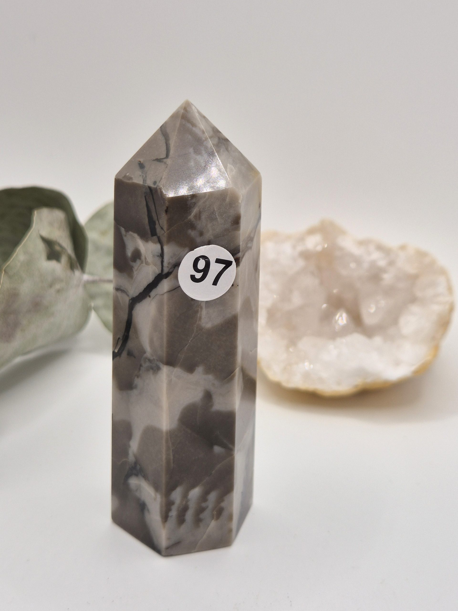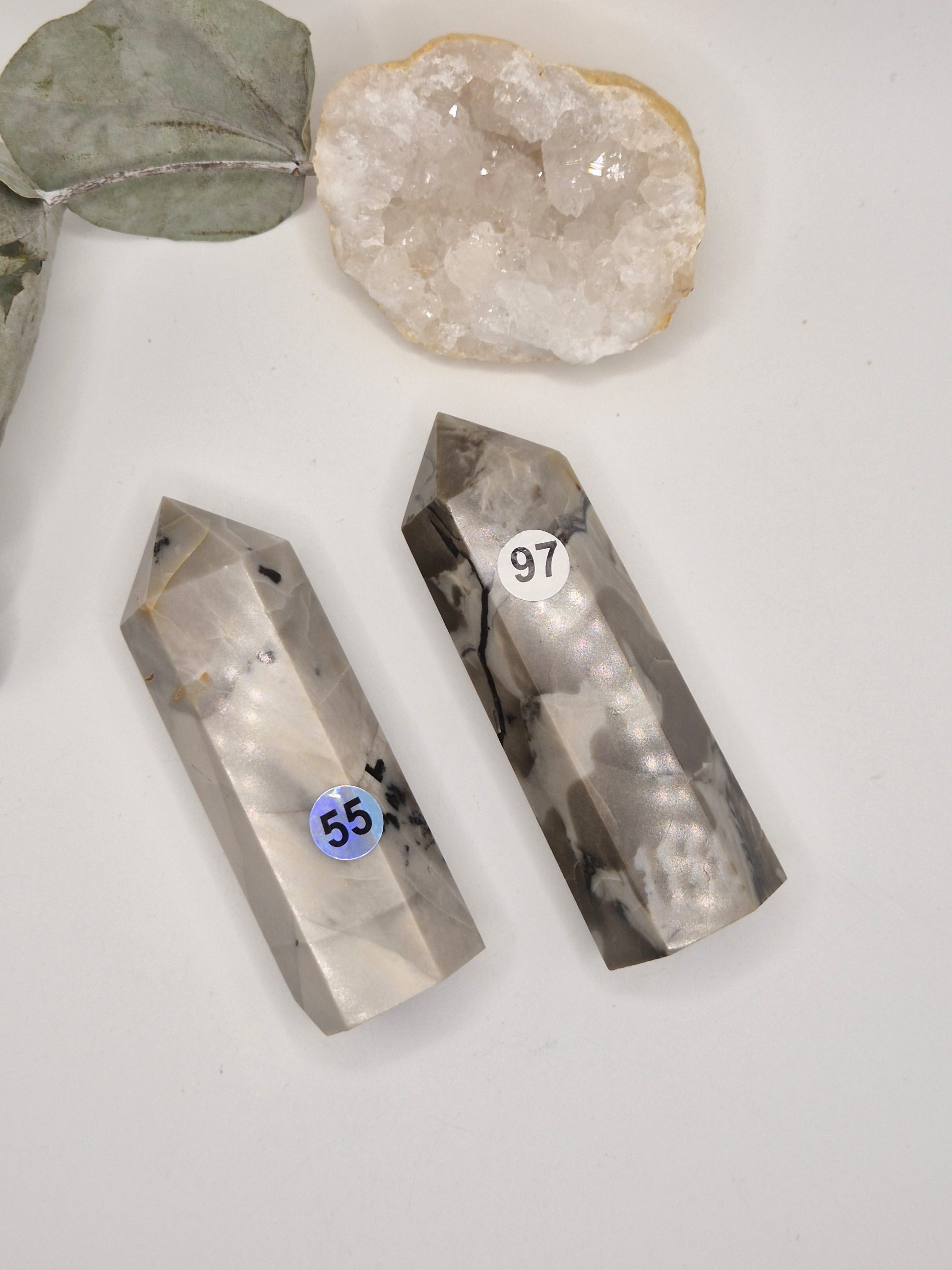 Avec ses contrastes minéraux entre cendres grises, veines noires et reflets lunaires, la pointe d’agate volcan est une pierre d’équilibre brut. Elle évoque les forces de la Terre en mouvement, l’énergie des origines, et invite à retrouver l’ancrage, la stabilité et la résilience.